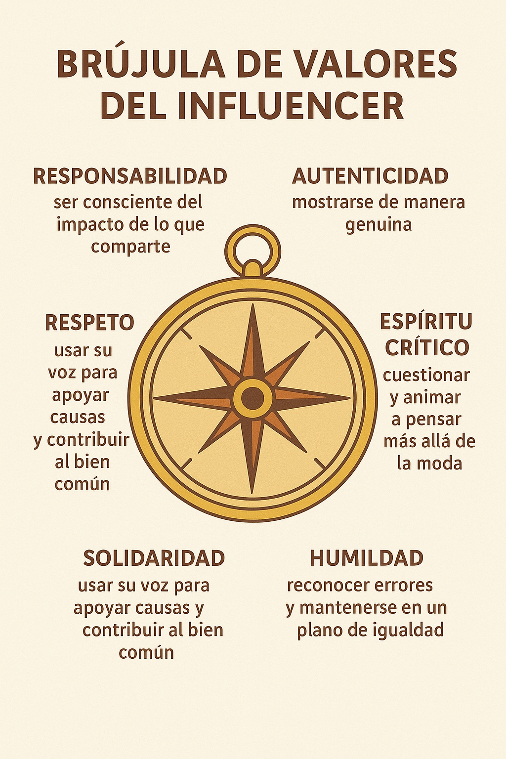 La Brújula de valores del influencer sintetiza este enfoque desde una mirada pedagógica clara y visual, proponiendo valores fundamentales que deberían orientar cualquier presencia digital: